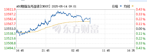 上证报中国证券网讯 5月14日,富时中国A50指数期货在上一个交易日夜盘收涨0.25%的基础上高开。截至9时01分,主力合约涨0.13%。